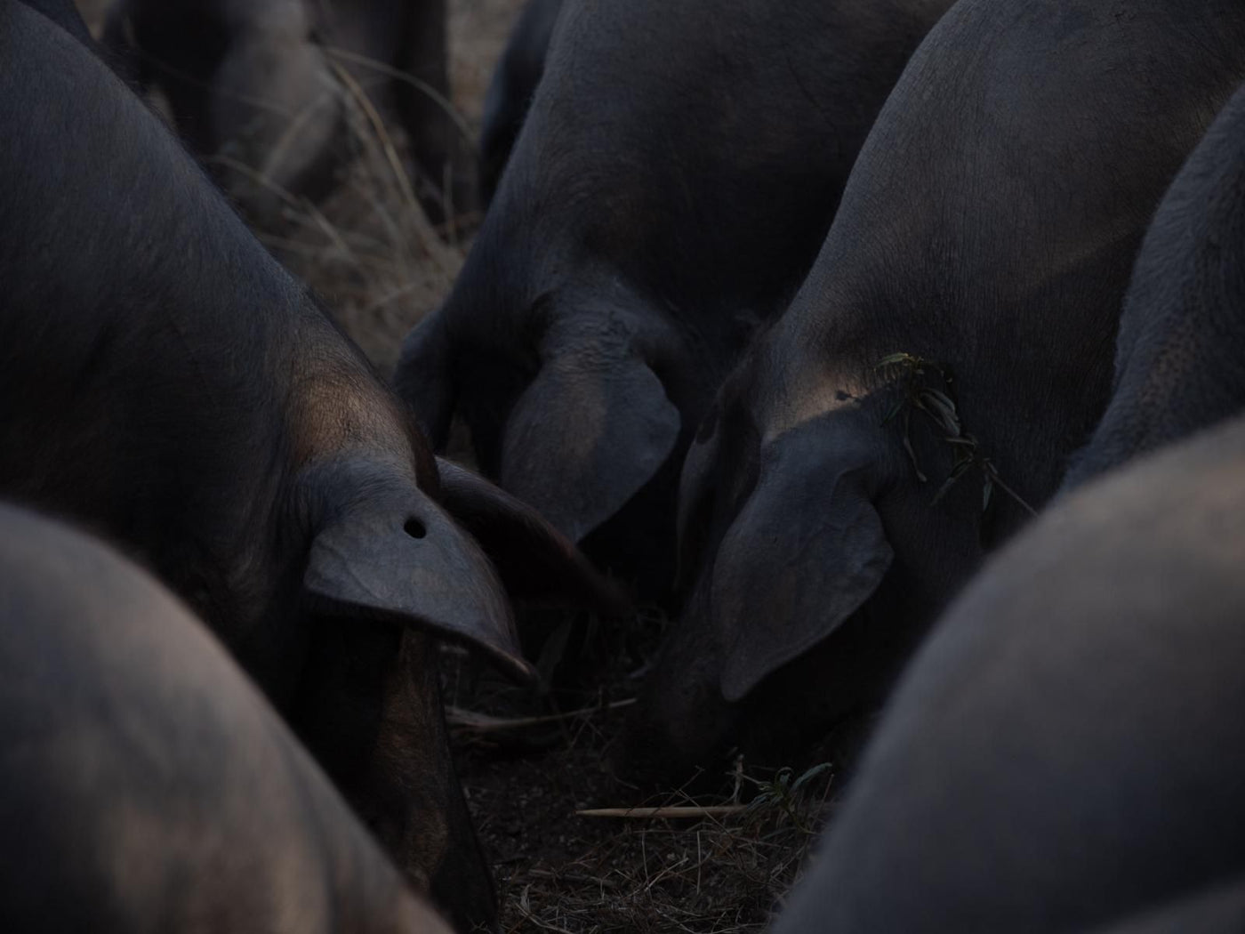 Durante la montanera, nuestros cerdos llegan a consumir una media de 9 Kg de bellota y alrededor de 3 Kg de pasto al día (además de otras hierbas, frutos silvestres, plantas aromáticas, frutos secos, etc.), y sin necesidad de probar un solo gramo de pienso.